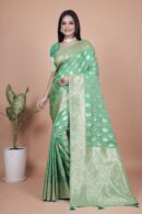 Step into timeless elegance with this Emerald Green Banarasi Silk Saree with Golden Zari Butti and Rich Pallu. Crafted from luxurious Banarasi silk, the saree features all-over golden zari butti motifs in teardrop and floral patterns, enclosed with delicate vine detailing, reflecting the finesse of traditional weaving.